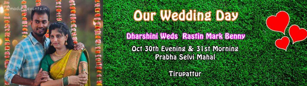Dharshini ♥ Rastin Mark Antony wedding organized by Madurai events at Prabha Selvi Mahal, Tirupattur on Oct 31st Morning. Events like Chenda melam, Photography, Welcome Dance, Welcome Entry Cold Pyro, Welcome Entry Smoke/Fog pots and Stalls like Welcome Drinks Water Melon, Ice cream, Beeda and Stage decoration organized by Madurai Events.