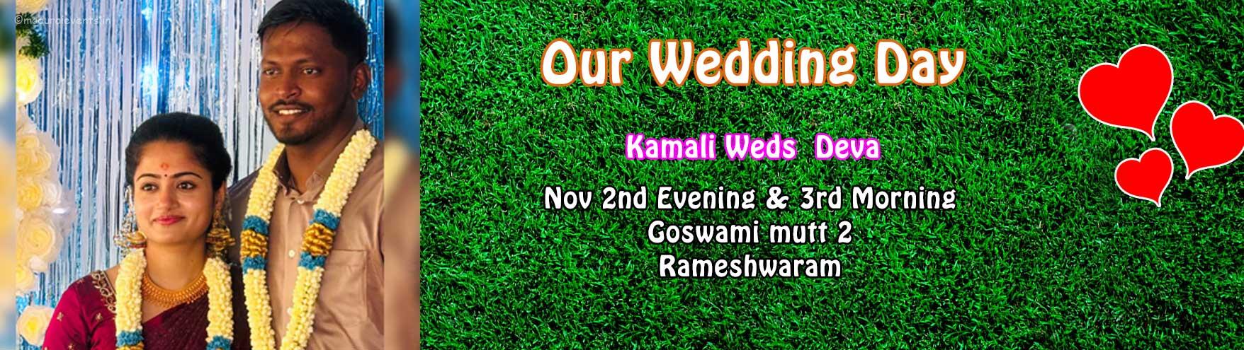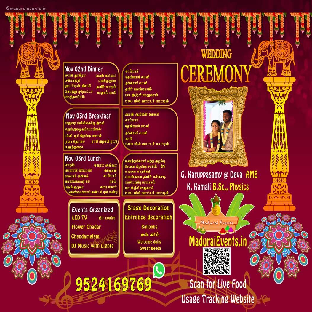 Kamali ♥ Deva wedding organized by Madurai events at Goswamy Mutt2, Rameshwaram on Nov 2nd Evening and Nov 3rd Morning. Events like Catering , Live counter stalls, LED TV 📺 Flower 🌸 ChadarChenda melam 🥁DJ Music 🎶 Air cooler Stage Decoration 🌸 Entrance decoration 🌸 Balloons 🎈 Ice cream 🍨 Welcome dolls 🎎 Sweet Beeda organized by Madurai Events.