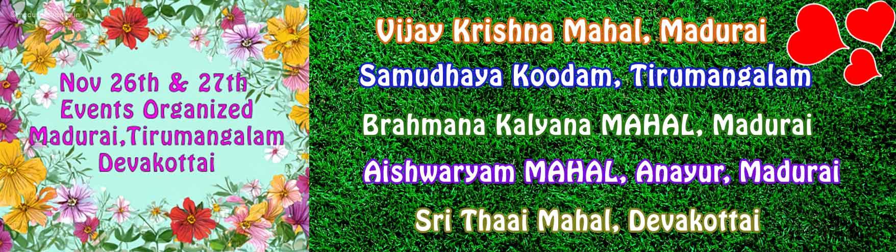 Madurai Events Organized multiple events in Madurai, Tirumangalam & Devakottai on Nov 26th & 27th. Events like Chendamelam, Nadaswaram, Cotton Candy, welcome_girls, Beeda, Welcome girls, Nadaswaram, Live Orchestra organized by Madurai Events.