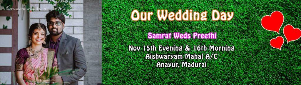 Samrat ♥ Preethi wedding organized by Madurai events at Aishwaryam Mahal, Anayur on Nov 15th Evening and Nov 16th Morning. Events like Mehndi, 90s kids stall, Iyer, welcome_girls, Bouncers , Cold Pyro, Chocolate 🍫 Fountains, Javvumittai, Beeda, Icecream, Balloon sculpting, stick balloons, flower chadar, car decoration, popcorn, Paani poori, Umbrella organized by Madurai Events.