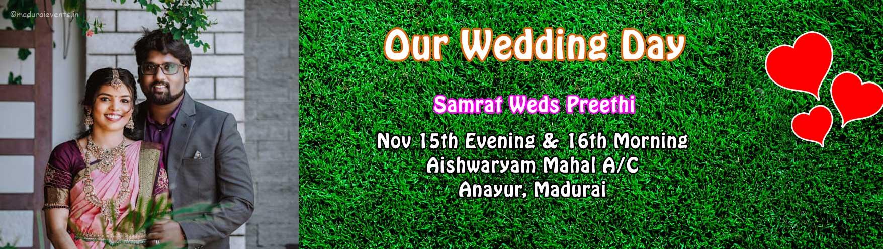 Samrat ♥ Preethi wedding organized by Madurai events at Aishwaryam Mahal, Anayur on Nov 15th Evening and Nov 16th Morning. Events like Mehndi, 90s kids stall, Iyer, welcome_girls, Bouncers , Cold Pyro, Chocolate 🍫 Fountains, Javvumittai, Beeda, Icecream, Balloon sculpting, stick balloons, flower chadar, car decoration, popcorn, Paani poori, Umbrella organized by Madurai Events.