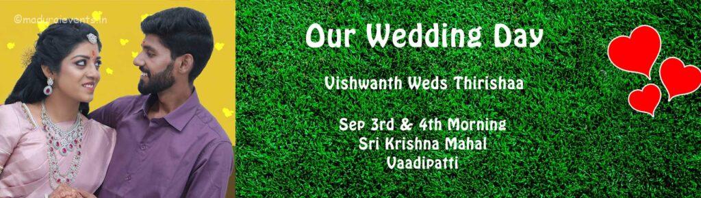 Vishwanth ♥ Thirishaa wedding organized by Madurai events at Sri Krishna Mahal, Vaadipatti on Sep 3rd Evening engagement and 4th Morning wedding. Events like Nadaswaram, Car decoration, Welcome girls,Welcome dolls, popcorn, ice cream, Flower chadar organized by Madurai Events.